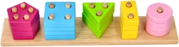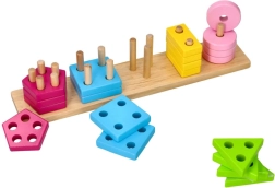 Dette træsorteringspuslespil kombinerer læring af farver og geometriske former med praktisk påsætning af brikker på pinde med forskelligt antal huller. Under legen træner børn finmotorik, greb, øje-hånd-koordination og logik.