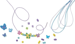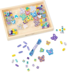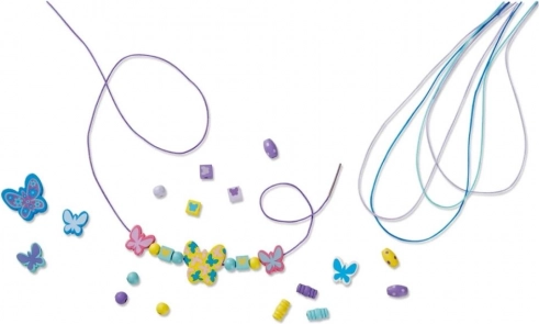 Sættet indeholder træperler i forskellige former (sommerfugle, blomster, kugler) og tekstilsnore – ideelt til at lave halskæder og armbånd. Udvikler finmotorik og kreativitet, anbefales fra 4 år.