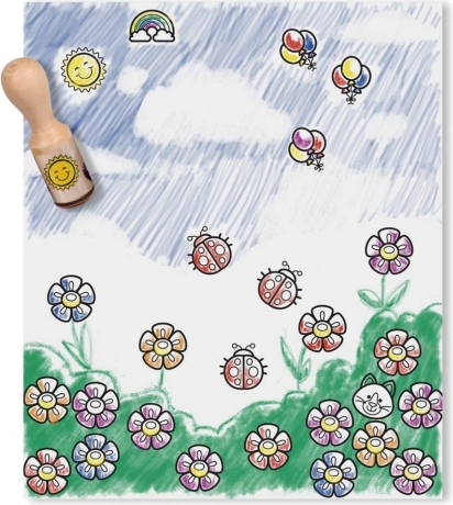 Holdbare trækroppe med motiver som sol, hjerte og sommerfugl sikrer godt greb og flotte aftryk på papir.