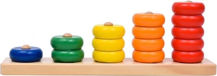 Dette kvalitets sorteringsspil i træ er perfekt til de første skridt i tal- og farveverdenen. Børn placerer ensfarvede ringe på de enkelte pinde i henhold til cifrene på basen og tilegner sig på legende vis tælling, sortering og hånd–øje-koordination.
