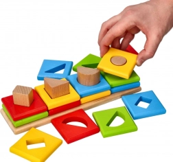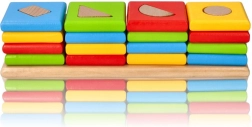 Massivtræ og robust udførelse sikrer lang levetid og sikker leg. Sættet indeholder en baseplade og 16 farvede firkanter, som kan stables, sorteres og kombineres efter form og farve – ideelt til Montessori-inspireret læring hjemme og i børnehaven.