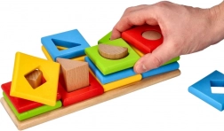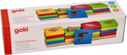 Dette kvalitets træpuslespil fra GOKI forener læring og leg. Fire søjler med farvede firkantede brikker og forskellige huller (cirkel, trekant, firkant m.fl.) lærer børn at genkende former og farver, samtidig med at de udvikler øje–hånd-koordination og præcise bevægelser.