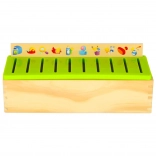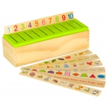 Denne smarte træleg udvikler det visuelle sanseapparat, koncentration og hånd-øje-koordination. Opgaven er at vælge den rigtige lille billedbrik og indsætte den i slotten under det matchende motiv på den store liste. Med tydelige illustrationer (tal, former, dyr, frugter, genstande) træner børn navngivning og sortering.