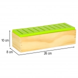 Solid æske af glat træ og grønt låg med sprækker for nem indsætning. Sikre, omhyggeligt slebne kanter.