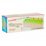 Opdag et sjovt trælegetøj til de mindste, der kombinerer leg og læring. Børn indsætter små brikker med billeder i de rigtige sprækker efter forlæg på de store lister. Understøtter logisk tænkning, finmotorik, genkendelse af former og billeder samt første engelskkundskaber takket være etiketterne på kortene.