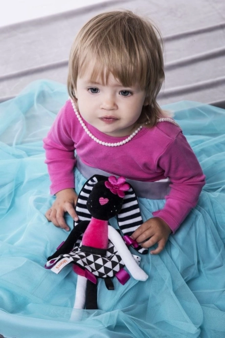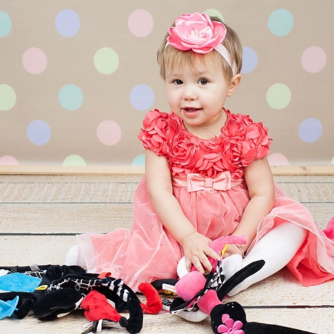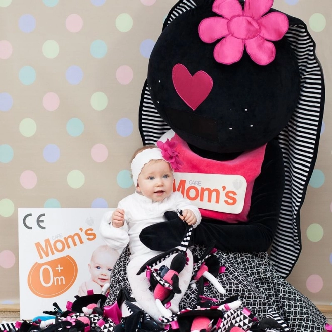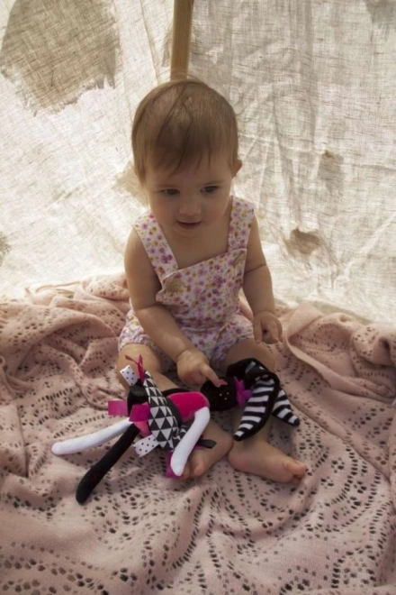 Denne bløde bunny er designet til at støtte barnets sanselige udvikling fra de allerførste dage. Tydelige kontraster, den blide knitren i ører og nederdel samt farverige mærker fanger naturligt opmærksomheden, beroliger og hjælper med at udvikle hånd-øje-koordination. De lange ører og lemmer er lette at gribe, så barnet træner griberefleks og finmotorik.