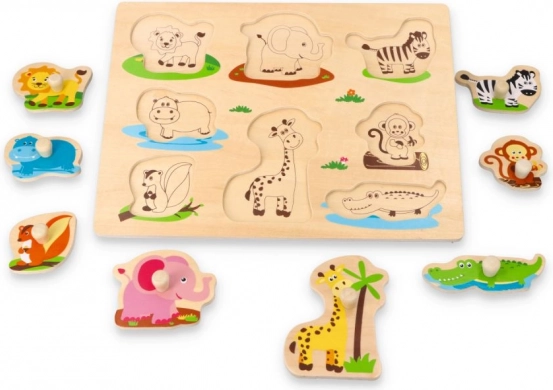 Træpuslespilsplade Jungle tilbyder masser af sjov og læring for de mindste. Dette pædagogiske legetøj opfordrer til udvikling af finmotorik og genkendelse af forskellige dyr.