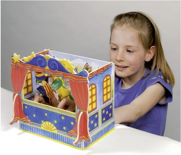 Bordteatret til hånddukker forvandler ethvert børneværelse til en lille scene. Takket være den solide ramme af lakeret træ er det stabilt, holdbart og behageligt at røre ved. Børn kan skabe deres egne historier, udvikle ordforråd og sociale færdigheder og have masser af sjov sammen med forældre eller venner.