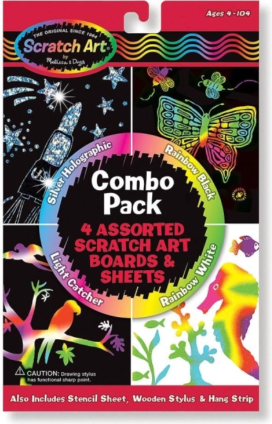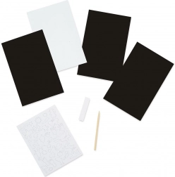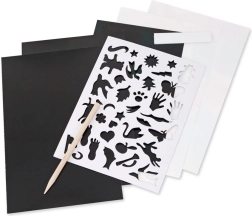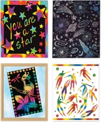 Med dette sæt skaber både børn og voksne originale kunstværker. Du skal blot forsigtigt skrabe med den medfølgende træpind på den sorte overflade, og nedenunder træder regnbue- eller holografiske farver frem. De færdige billeder kan nemt indrammes og udstilles.