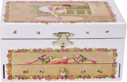 Dette charmerende smykkeskrin i stil med en spilledåse udmærker sig ved det fine design og den magiske overraskelse indeni. Når låget åbnes, starter den klassiske melodi Svanesøen, og den lille ballerina begynder at dreje foran spejlet. Takket være skuffen og den inddelte plads opbevarer du nemt ringe, armbånd og andre skatte.