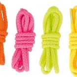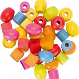 Sættet indeholder farverige træperler og tilstrækkeligt lange snore, ideelle til kreative projekter.