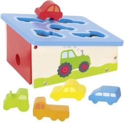 Denne kvalitets træ-indsætningsboks fra GOKI med åbent låg og udsparinger formet som køretøjer er et ideelt redskab til den første udforskning af former. Børn lærer på en sjov måde at genkende former og farver, udvikler hånd-øje-koordination og træner finmotorikken.
