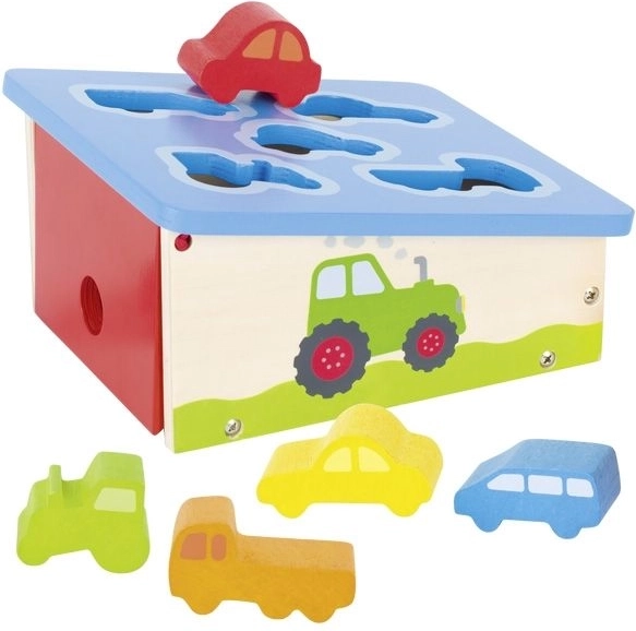 Træindsætningsboks med køretøjstema understøtter finmotorik, logisk tænkning og læring af former og farver. Massivt træ, sikker forarbejdning og legende design til de mindste.