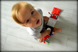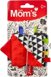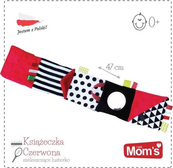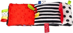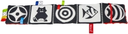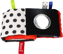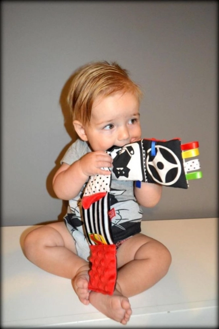 En blød stofbog til de allermindste med kontrastmønstre i sort, hvid og rød, som understøtter synsopfattelse, finmotorik og taktil udforskning. Indeholder knitrende sider, bånd og et sikkert spejl til leg og udvikling fra de første dage.