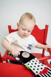 Den røde sansebog er designet til nyfødte og spædbørn 0+. Den høje kontrast i sort-hvide grafikker med røde accenter fanger naturligt barnets opmærksomhed, mens den bløde polstring og de mange teksturer indbyder til berøring. Takket være de kompakte mål kan den nemt tages med i barnevognen eller fastgøres i barnets synsfelt.