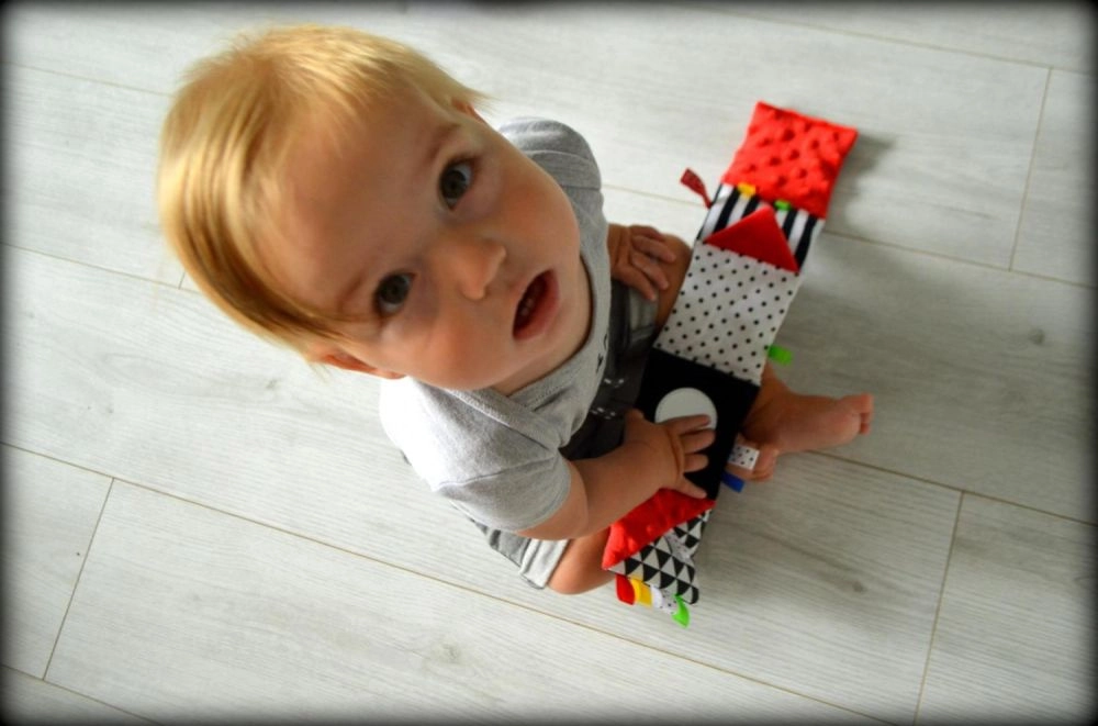Bogen byder på interaktive elementer – bånd til at gribe, knitrende paneler, et sikkert spejl og forskellige materialer (frotté, minky), som stimulerer flere sanser på én gang. Understøtter synsudvikling, øje–hånd-koordination, griberefleks og sensorisk integration.