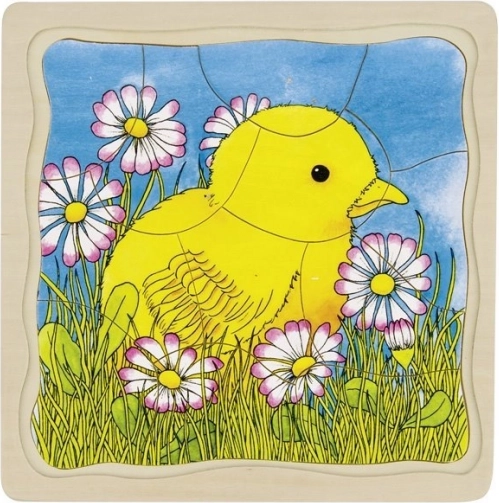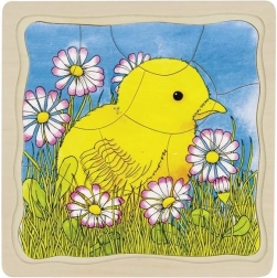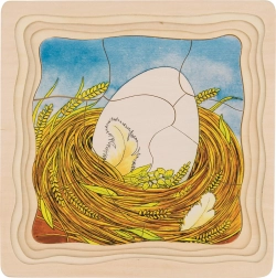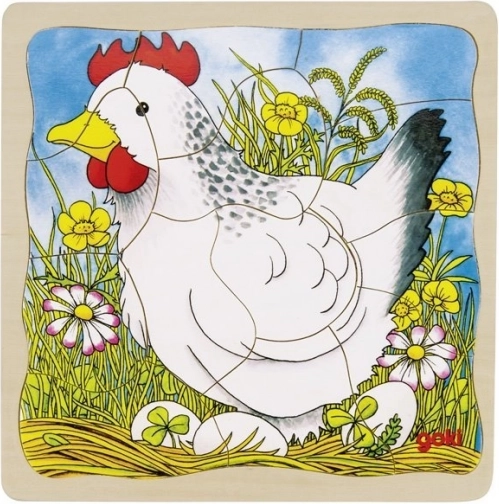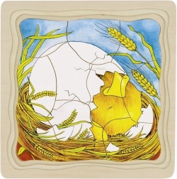 Det særlige træpuslespil er opdelt i fire billedlag, hvor hvert lag viser et udviklingsstadie hos hønen. Hvert lag har sit eget design og et forskelligt antal brikker, hvilket giver variation og stimulerer barnets fantasi. Puslespillet ligger i en solid plade med fræsede kanter, som fungerer som en stabil base under samling.