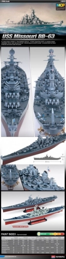 USS Missouri (BB-63), berømt for Japans kapitulation ved afslutningen af Anden Verdenskrig, hører til blandt verdens mest berømte krigsskibe. Dette plastbyggesæt i skala 1/700 gør det muligt at skabe en realistisk model med fin overfladengravering og troværdige proportioner af Iowa-klassen. Modellen er beregnet til limning og efterfølgende maling.