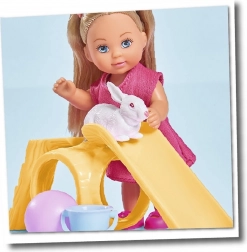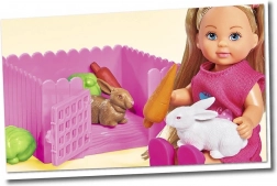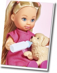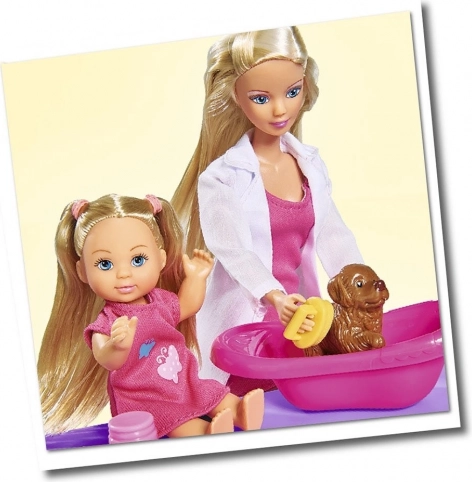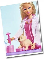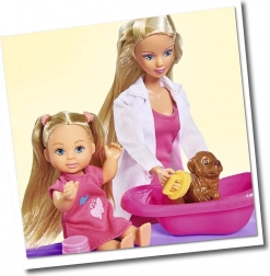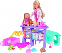 Dyrlægen SteffiSteffi og Evi med 4 dyr til behandling.Sættet indeholder en station, en hundehytte, et bur til et dyr, en legeplads og mange andre tilbehør. I alt: 35 dele.Steffis højde: 29 cmEvis højde: 12 cm