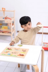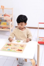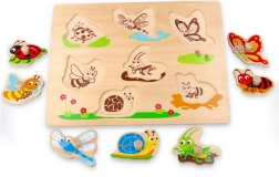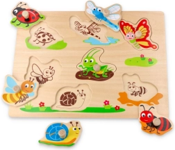 Opdag et træpuslespil med knopper med insektmotiv, som styrker finmotorik, hånd-øje-koordination og opfattelse af former og farver. Sikker udførelse i kvalitets træ med CE-certificering og behagelige greb til små hænder.