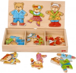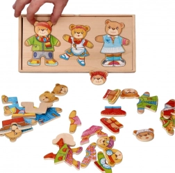 Dette populære træpuslespil tilbyder børn en sjov leg med påklædning af bamsefamilien. Det består af 36 dele, som inkluderer 12 forskellige sæt tøj, hvilket giver børn mulighed for at udvikle deres fantasi og kreativitet.
