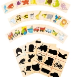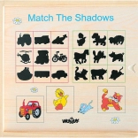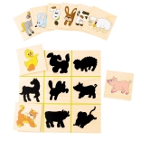 Farverige træbrikker med illustrationer af dyr og køretøjer matches af børnene med de tilsvarende skygger. En sjov form, der understøtter skelnen mellem former og træner opmærksomheden.