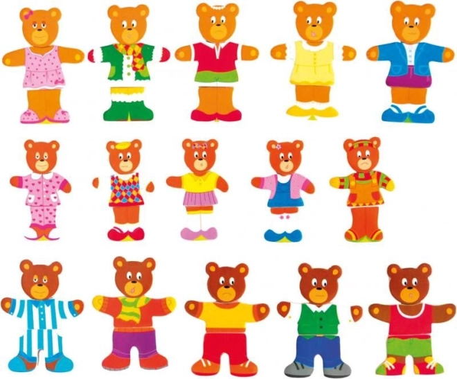 Kjol bjørnene efter humør og anledning, og lær samtidig at kombinere former og farver. Børn kan nemt skifte hoveder, kroppe og ben, træner deres iagttagelsesevne og skaber muntre fortællinger. Den praktiske trækasse holder alle dele samlet, og låget fungerer som et stabilt underlag til puslespillet.