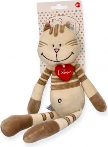 Den søde plyskat med blød, beige pels og brune striber er et ideelt første krammedyr til både babyer og større børn. Den har lange ben, et bredt smil og et lille filthjerte om halsen. Den er let, nem at gribe og sikker fra alder 0+. For nem vedligeholdelse kan den håndvaskes ved 30 °C.