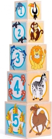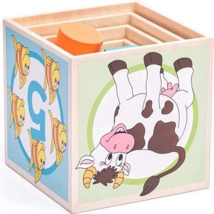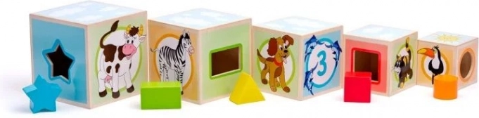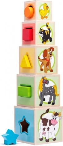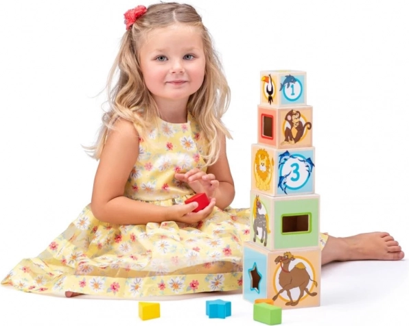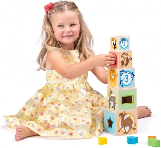 Trætårn med kopper og formesorter kombinerer stabling i højden med øvelse i at lægge de rigtige former i de tilsvarende åbninger. Børn udvikler hånd-øje-koordination, lærer farver, tal og dyr og får samtidig masser af kreativ leg.