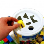 Spanden har et låg med formede åbninger, hvor børnene lægger de matchende klodser i, hvilket støtter udviklingen af genkendelsesevner.