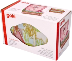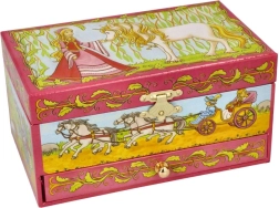 Smykkeskrinet i musikkassestil er det ideelle tilbehør til små damer, der ønsker at opbevare deres smykker med elegance. Ved åbning begynder melodien fra operaen Svanesøen at spille, og den hvide hest begynder at danse foran spejlet.