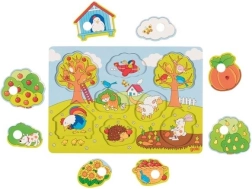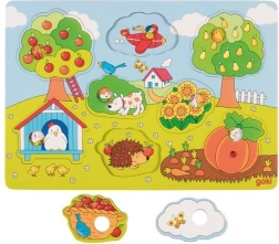 Goki træpuslespil I haven er et farverigt legetøj, der er ideelt til at udvikle børns motoriske og kognitive færdigheder. Det har otte farverige brikker med en baggrundstegning, der passer perfekt på sin træplade.