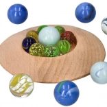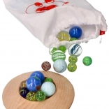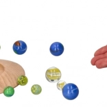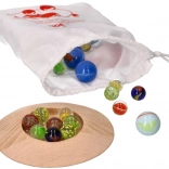 Tag dine yndlingskugler med overalt i den praktiske bomuldspose. Sættet indeholder 31 farverige glaskugler og et træhul, hvilket gør det til et ideelt valg til leg indendørs. Det understøtter kreativitet og udvikler børns finmotorik. Hvem er den dygtigste og får flest kugler i hullet?