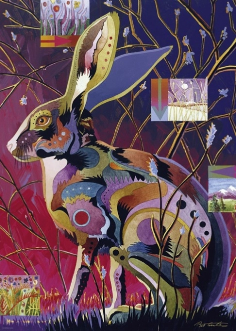 Dette designpuslespil præsenterer en markant, dekorativ komposition af kunstneren Bob Coonts, som bor i Rocky Mountains og er kendt for sin farverige stil, der fanger dyrenes skønhed. Kaninmotivet glæder både naturelskere og samlere af originale illustrationer.