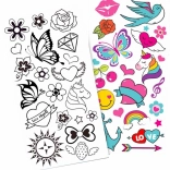 Sættet med tatoveringsmarkere er ideelt til små kunstnere, der vil udtrykke deres stil sikkert og legende. Med skabeloner, glittertuscher og dekorative klistermærker opstår midlertidige motiver fulde af farver og glimmer.