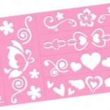 Genanvendelige skabeloner med blomster, hjerter og sommerfugle gør det let at tegne favoritmotiver hurtigt og rent.