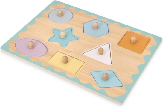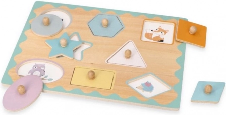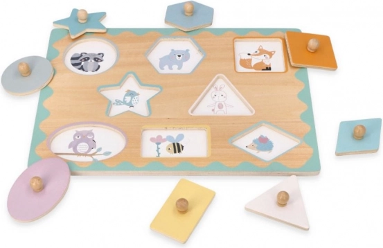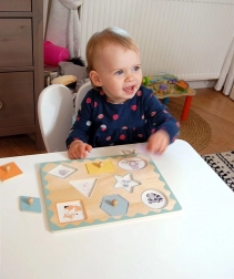 Oplev et robust træpuslespil med knopper, hvor hver brik har sin præcise plads. Overskuelige former, bløde pastelfarver og kære dyremotiver indbyder til leg, mens de praktiske knopper gør det let at gribe selv for de allermindste.