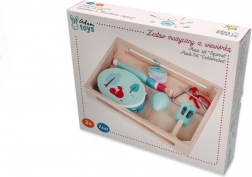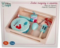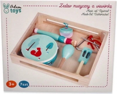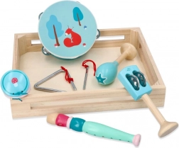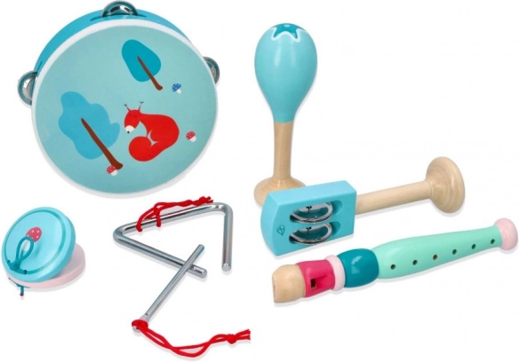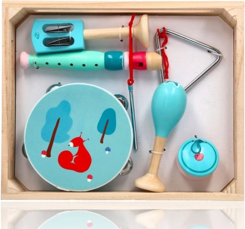 I sættet finder du en tamburin med fire bjælder og et sødt egern, en mintfarvet fløjte, maracas med blomstermotiv, kastagnetter med svamp, håndbjælder med blad, en metaltriangel med kølle, og det hele er placeret i en praktisk træbakke/æske for nem opbevaring og transport. Perfekt til hjemmemusik, børnehaver og fritidsordninger.