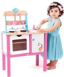 Oplev det magiske WOODY legekøkken med enhjørningemotiv, som forvandler børneværelset til et kreativt kulinarisk studio. Takket være den omhyggelige udførelse i kvalitetsplywood og træ er det stabilt, holdbart og visuelt attraktivt – et godt valg til daglig madleg.