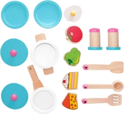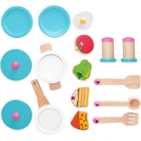 Gryde, pande, låg, øse, saltbøsse, peberkværn og andre småting giver madlegen realisme og variation. Alt er tilpasset børnehænder.