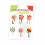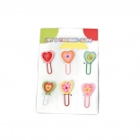 Søde træklemmmer i et sæt med 6 stk. pyntet med motiver af hjerter eller blomster, som frisker dine noter, gaver og pynt op. Hver klemme har en anden farve og et glitrende sten i midten. Ideelle til dekoration, fotocollager, planlæggere og børnenes kreativitet.