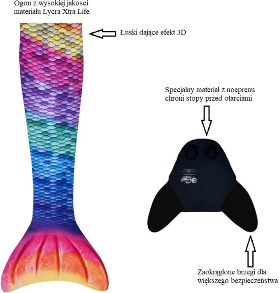 Et komplet og livligt farvet hale med monofinne efterligner havfruens bevægelse i vandet.