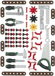 Sav, hammer, nøgler, bidetænger, file, skruer og samlestykker – alt hvad barnet behøver til at bygge og skrue.