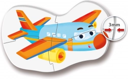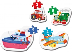 Det første sæt puslespil til de mindste med motiver af transportmidler indeholder fire puslespil med 2, 3, 4 og 5 brikker. Store 3 mm brikker er lette at gribe, fremmer finmotorik, hånd–øje-koordination og rumlig orientering. Ideelt fra 2 år.