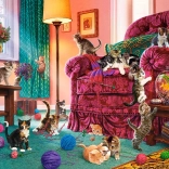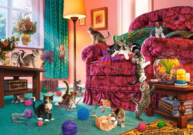 Puslespillet viser en hyggelig stue fuld af legesyge killinger og farverige garnnøgler.