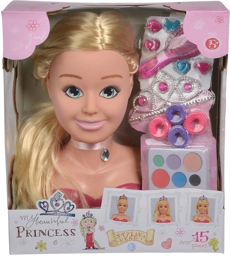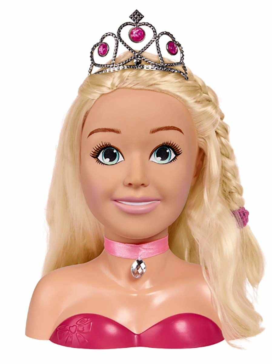 Dette fortryllende stylinghoved med lange blonde hår og lyserødt bånd med sten er ideelt til små frisører og stylister. Takket være sættet af tilbehør – fra den sølvfarvede krone til børste, hårklemmer og elastikker samt en palette med makeup – kan børn nemt skabe eventyrlige frisurer og blid makeup.