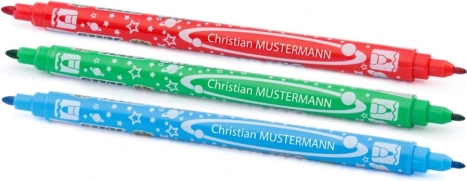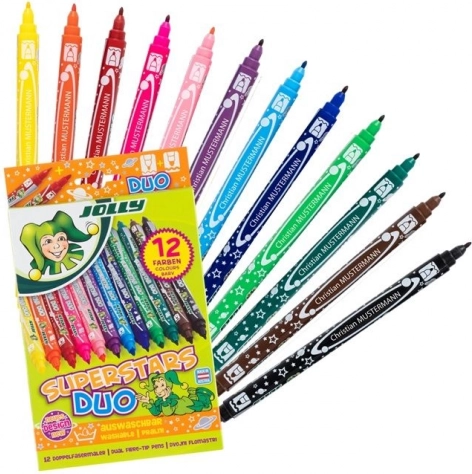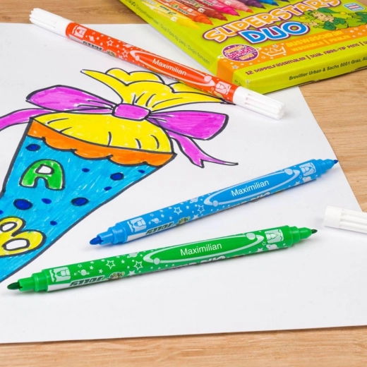 Dobbeltendede tuscher Superstars Duo – sæt med 12 mættede farver. To spidser til detaljer og farvelægning, længde 17 cm, sikre for børn 3+, CE-certificeret.