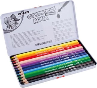 Udforsk kreative muligheder med JOLLY Supersticks Aqua akvarelfarveblyanter. Brug dem tørre for dækkende farver, eller tilføj vand og forvandl stregerne til bløde akvarelmalerier. Metalæsken beskytter blyanterne på farten og derhjemme og holder dem pænt organiseret.