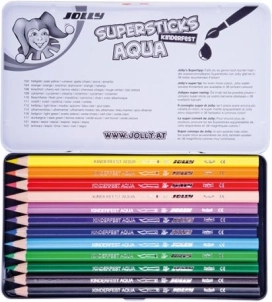 Sæt med 12 akvarelfarveblyanter i en praktisk metalæske til både små og store skabere. JOLLY Supersticks Aqua kan nemt tones med vand for bløde overgange og effekter, har en robust kerne og lang levetid. Ideel til rejser og kreativitet derhjemme. Akvareleffekt, 12 mættede farver, solid metalæske, velegnet fra 3 år.