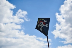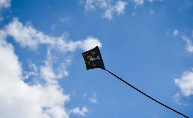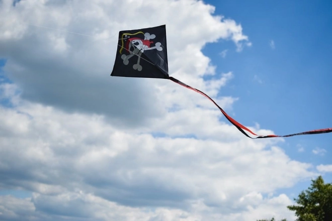 Det sorte motiv med kranie og korslagte knogler er tydeligt synligt mod den blå himmel og giver din flyvning et strejf af eventyr.
